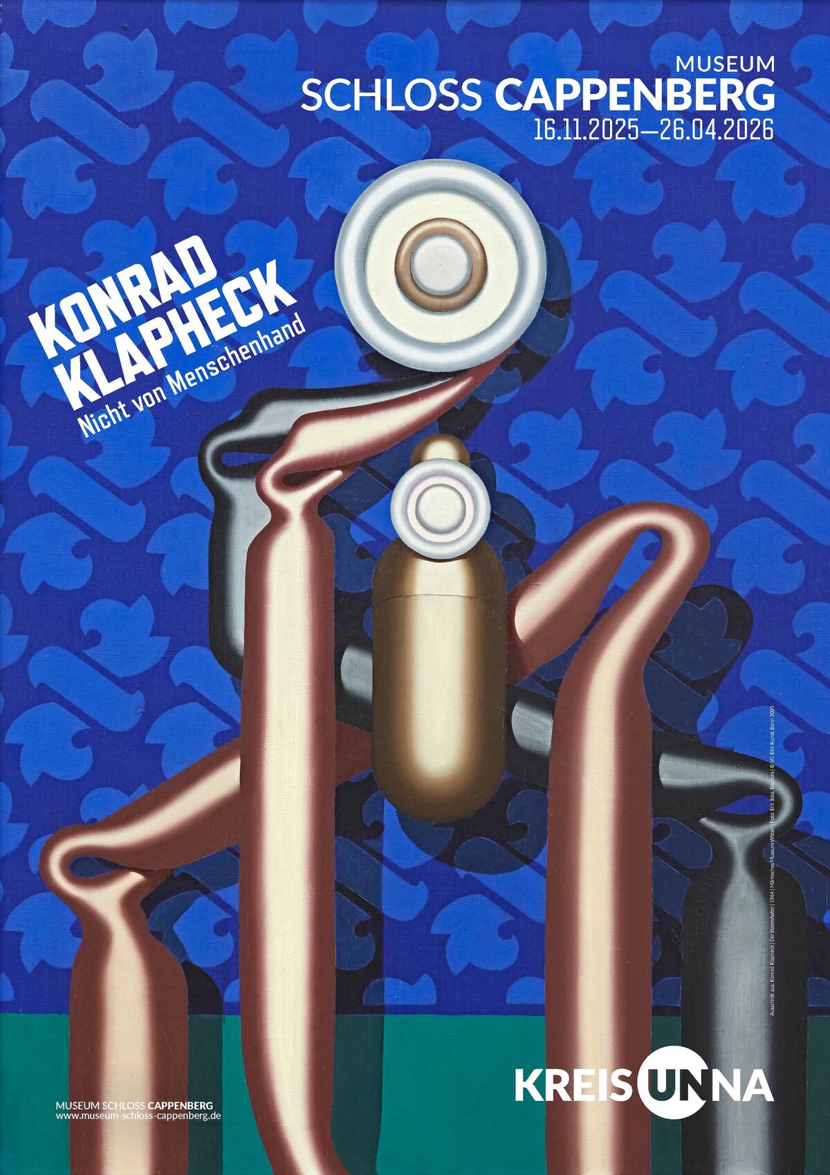 Die Einzelausstellung „Nicht von Menschenhand“ (16.11.2025 – 26.04.2026) im Museum Schloss Cappenberg fokussiert auf die „maschinensachlichen“ Bilder von Konrad Klapheck (1935–2023), in denen banale Alltagsobjekte zu Sinnbildern einer von Technik geprägten Gesellschaft werden. Zwischen nüchterner Präzision, surrealer Tiefenschärfe und subtiler Gesellschaftskritik eröffnen seine Werke neue Perspektiven auf die Kunst der Nachkriegsmoderne – und auf ihre bis heute anhaltende Aktualität.