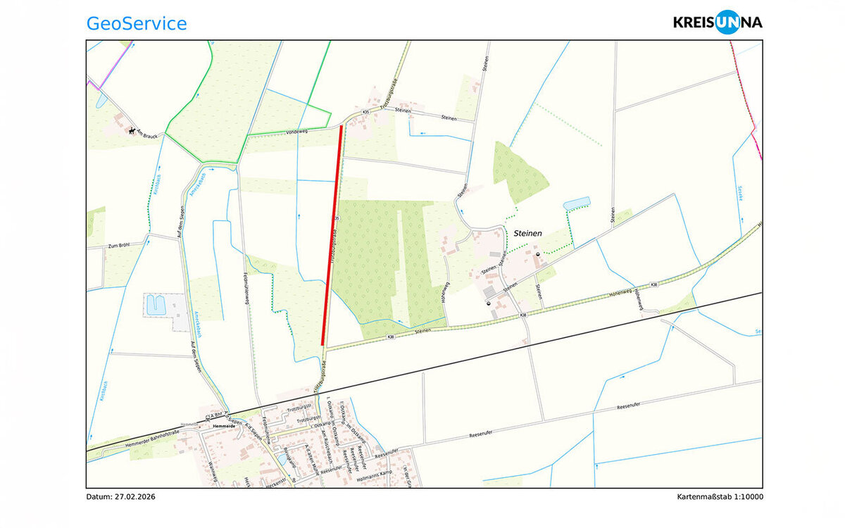 Die Trotzburgstraße (Kreisstraße 35) in Unna-Hemmerde wird ab Montag, 2. März, voll gesperrt. Grund dafür sind Baumpflegearbeiten. Umleitungen werden über die östliche Straße „Steinen“ und die westlich gelegene Straße „Auf dem Siepen“ eingerichtet. Die Arbeiten dauern voraussichtlich bis zum 13. März.