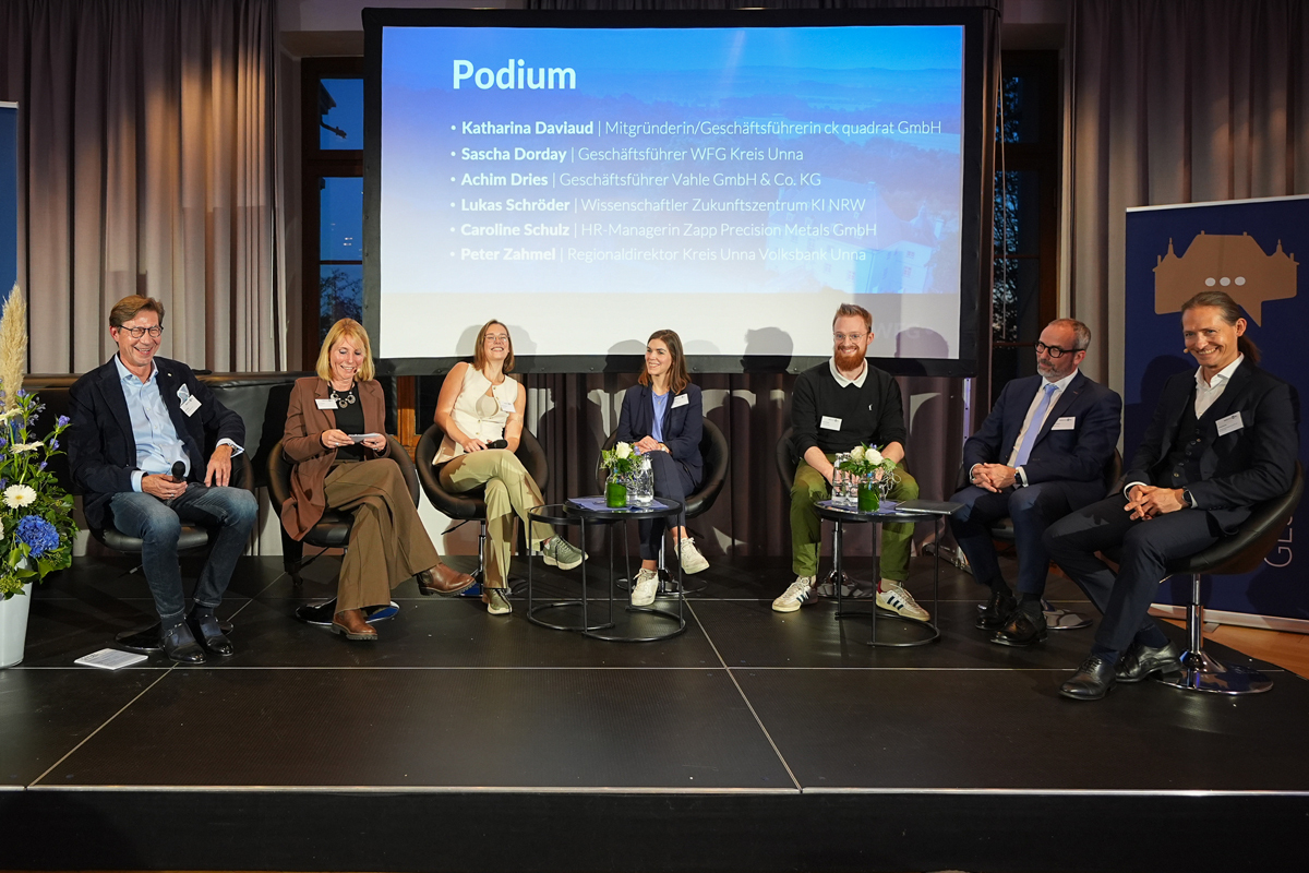 In der anschließenden Podiumsdiskussion berichteten Katharina Daviaud (Mitgründerin und Geschäftsführerin der ck quadrat GmbH), Achim Dries (Geschäftsführer der Vahle GmbH & Co. KG), Lukas Schröder (Wissenschaftler am Zukunftszentrum KI NRW), Caroline Schulz (HR-Managerin bei der Zapp Precision Metals GmbH), Peter Zahmel (Regionaldirektor Kreis Unna, Volksbank Unna – Zweigniederlassung der Volksbank Dortmund-Nordwest eG) sowie WFG-Chef Sascha Dorday, wie das Thema Wissensmanagement in ihren Betrieben umgesetzt wird und wie sie den damit einhergehenden Herausforderungen für die Zukunft begegnen.