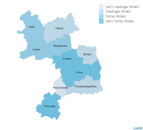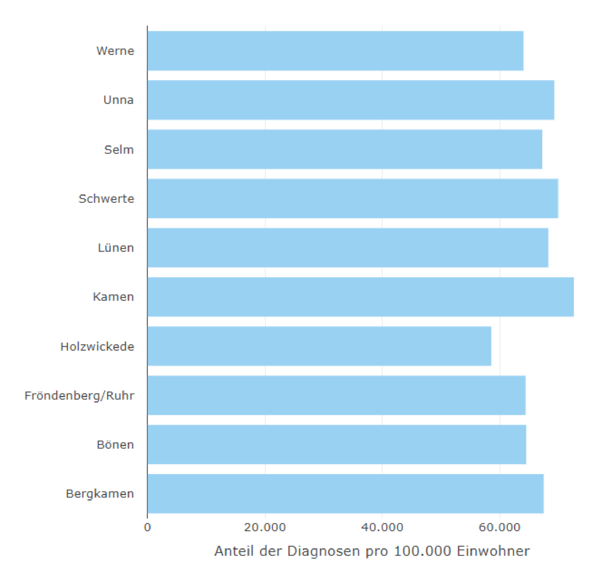 Die Gesundheitsberichterstattung des Fachbereichs Gesundheit des Kreises Unna hat zusammen mit der Abgeschotteten Statistikstelle des Fachbereichs Geoinformation und Kataster ein innovatives, interaktives Dashboard entwickelt. Dieses bietet ab sofort eine datengestützte Übersicht zu sieben ausgewählten Diagnosefeldern auf Basis der Abrechnungsdaten der Kassenärztlichen Vereinigung. Das Dashboard stellt gesundheitliche Versorgungsbedarfe sowie regionale Unterschiede transparent und nachvollziehbar dar und richtet sich sowohl an interessierte Bürgerinnen und Bürger als auch an andere Behörden, Städte und Gemeinden des Kreises Unna.