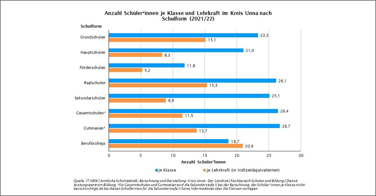 So sind die kreisweit größten Klassen bei Gymnasien mit 26,7 Schülern pro Klasse vorzufinden, dicht gefolgt von Gesamtschulen mit 26,4 Schülern pro Klasse. Die durchschnittlich meisten Schüler pro Lehrer gibt es hingegen bei Berufskollegs mit 20,9 Schüler pro Lehrer. Förderschulen im Kreis Unna haben sowohl die kleinste Anzahl an Schüler pro Klasse mit durchschnittlich 11,8 Schüler pro Klasse als auch die geringste Zahl von Schüler pro Lehrkraft, hier gibt es ungefähr 5,2 Schüler pro Lehrer.