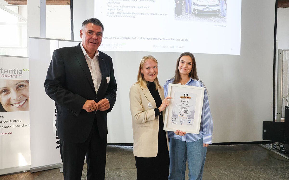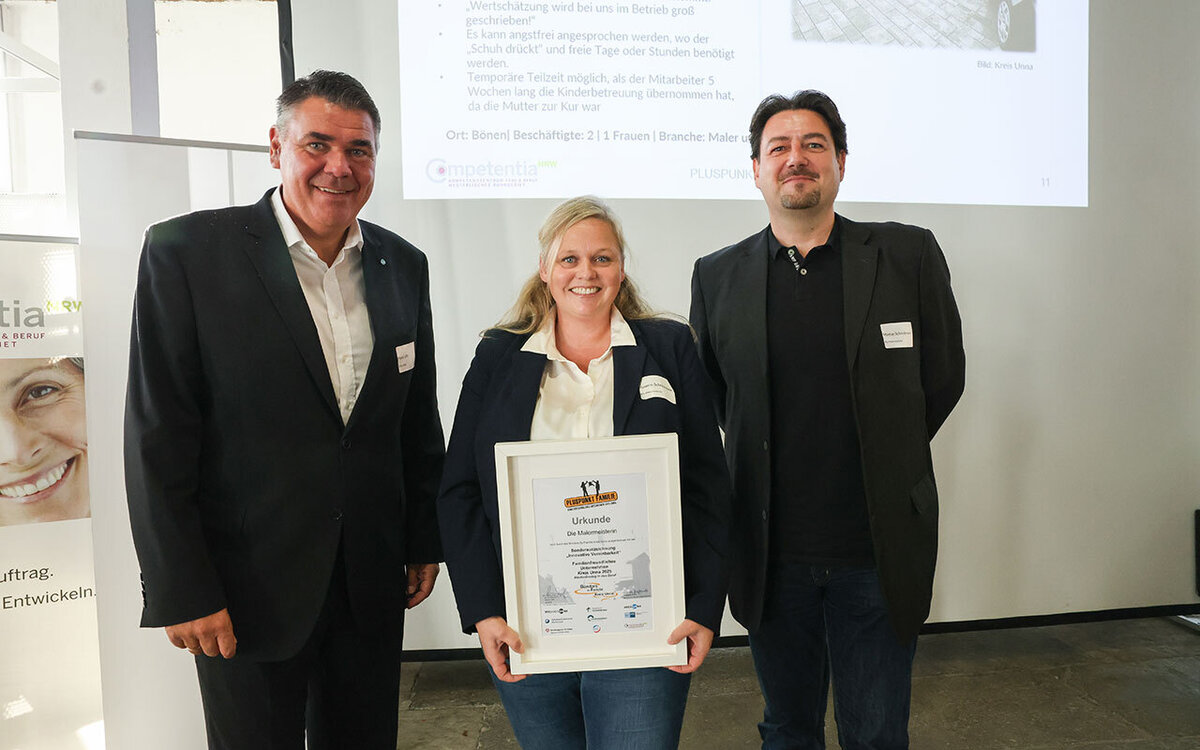 Ein Sonderpreis geht an eine Malermeisterin, die nur einen Mitarbeiter hat. Diesen hat sie aber schon zwei Mal bei einem Wiedereinstieg begleitet. „Ein besonderes Beispiel für einen Handwerksbetrieb das Vieles möglich macht“, urteilte die Jury. Ein weiterer Sonderpreis geht an das Cariflex-Team. Das ist ein Springer-Team der Caritas Lünen/Werne/Selm: Die Mitarbeitenden können ihre Arbeitszeiten selbst bestimmen und haben keinen Schichtdienst.