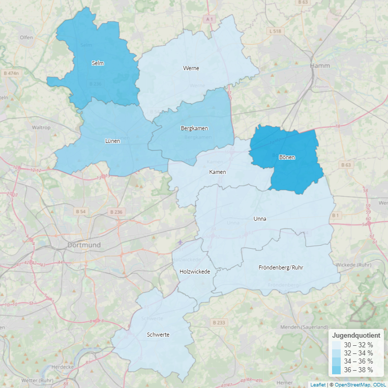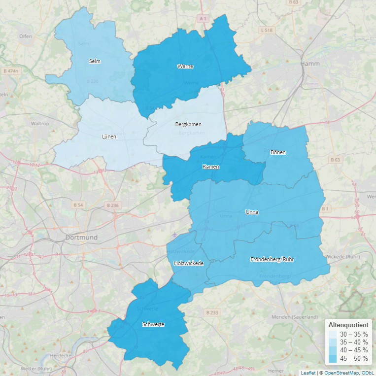 Enthalten sind u.a. die Anzahl der Personen in verschiedenen Altersklassen sowie der Jugend- und Altenquotient. Anhand dieser Daten wird die Altersstruktur der Städte und Gemeinden im Kreis dargestellt.
